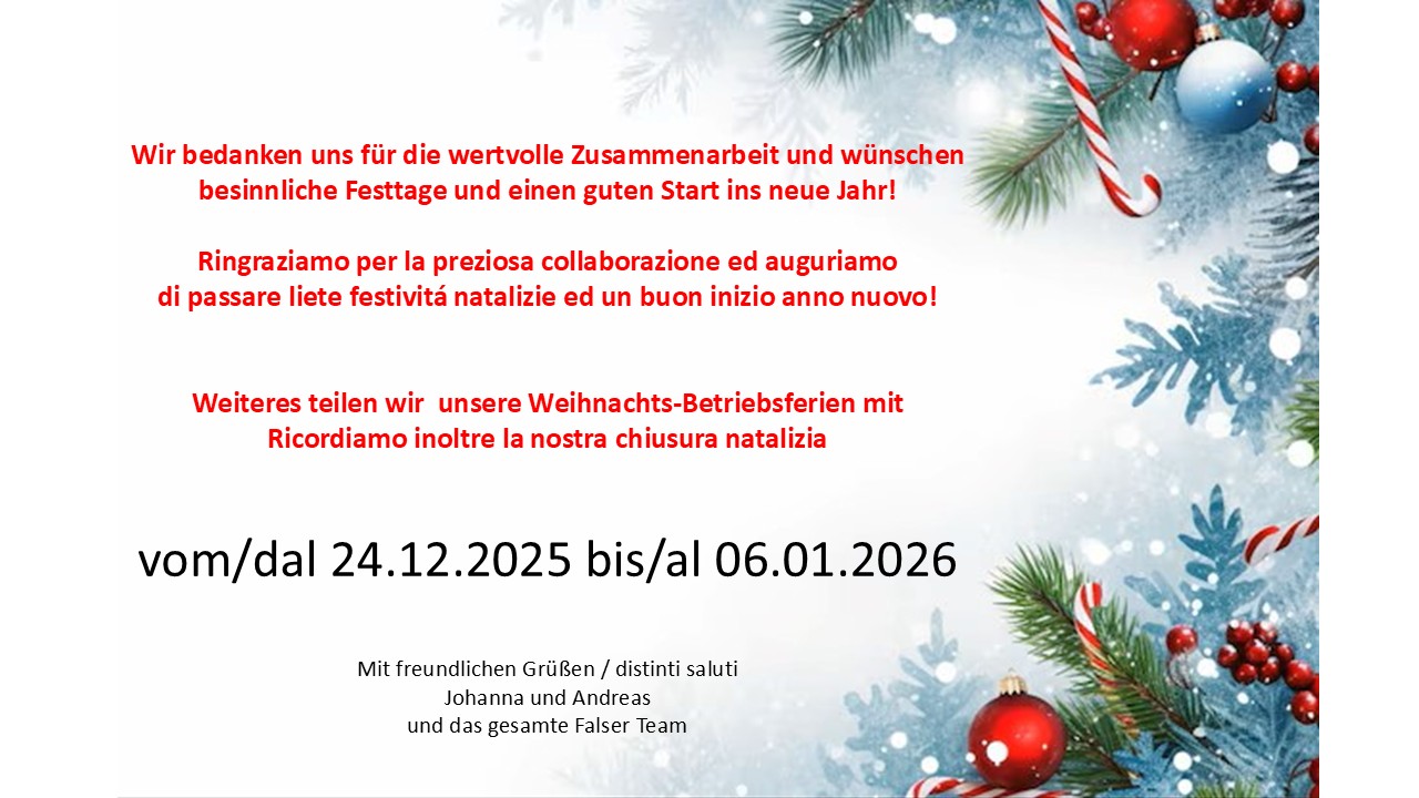 La ditta Falser Engineering situata ad Ora, Alto Adige, nasce grazie all’esperienza pratica pluridecennale, sia nella produzione che nella progettazione e distribuzione in Italia ed all’estero di prodotti di alta qualità.